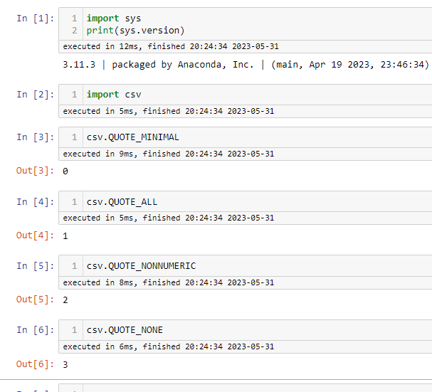 指示writer对象为所有非数字字段加上引号 指示reader将所有未用引号引出的字段转换为 float 类型 - csv.QUOTE_NONE,等于3